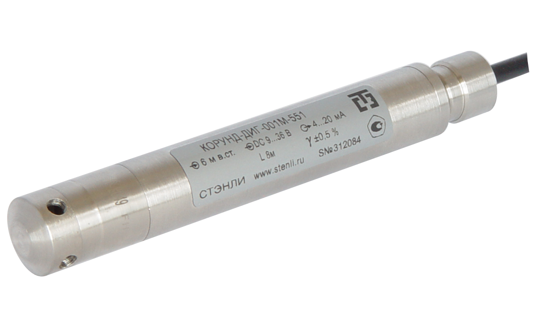 Датчик уровня КОРУНД-001М-551-0,1 (Погрешность)-0,6мвс (Верхний предел измерения и единицы измерения)-42 (Выходной сигнал)-0050 (Диапазон компенсации температурной погрешности)-PUR7 (Материал и диаметр оболочки вентилируемого кабеля)-NBR (Материал уплотнения)-61м (Длина выводного кабеля, в метрах)